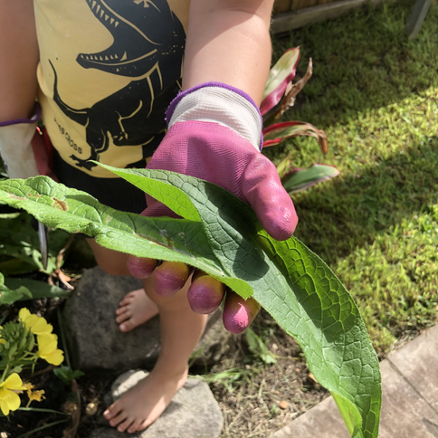 One of the great things about being a herbalist and growing your own herbs is you’re always at the ready! A recent broken toe in the house (not mine) required some harvesting of comfrey to make a poultice. My faithful trainee herbalist (my 7 year old daughter) helped!